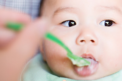 Kayla had her first serving of solid food yesterday. We mashed up some ripened banana, and she LOVED it. Today we offered her the more traditional solid food starter, which is rice cereal. She showed a lot less enthusiasm.